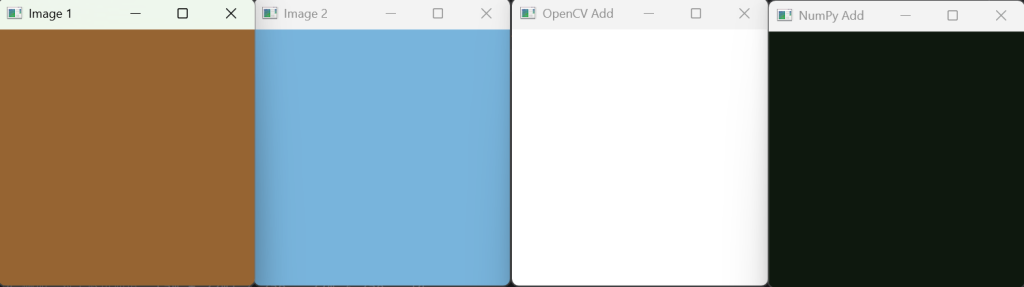 print("OpenCV Add (pixel [0,0]):", cv_added_img[0,0]) # 应该接近 [255, 255, 255]