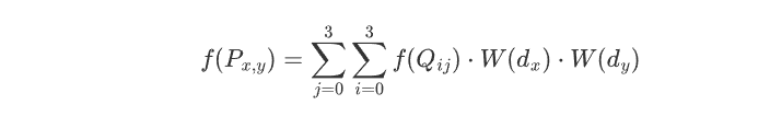 f(P_{x,y}) = \sum_{j=0}^{3} \sum_{i=0}^{3} f(Q_{ij}) \cdot W(d_x) \cdot W(d_y)