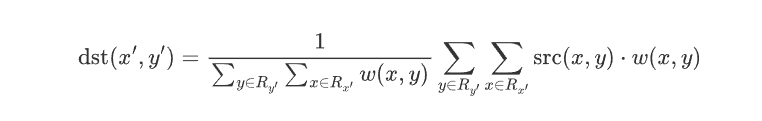 \text{dst}(x’, y’) = \frac{1}{\sum_{y \in R_{y’}} \sum_{x \in R_{x’}} w(x, y)} \sum_{y \in R_{y’}} \sum_{x \in R_{x’}} \text{src}(x, y) \cdot w(x, y)