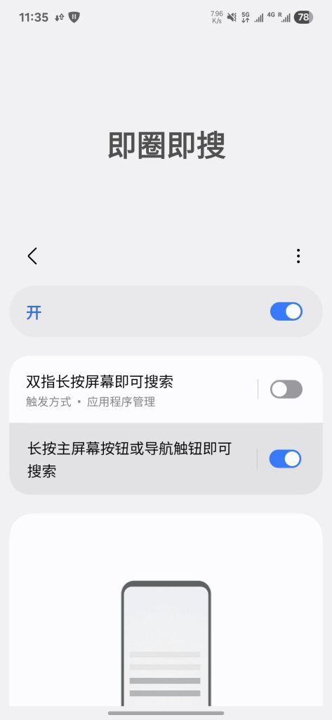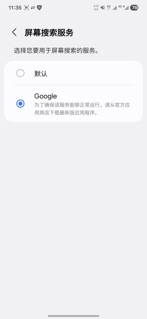 国行三星无需繁琐的配置,可以直接在设置中里头将原本的既圈既搜(其实是百度提供的)设置为GOOGLE的既圈既搜。